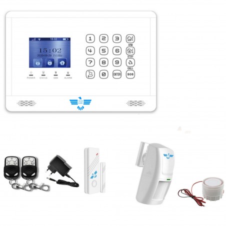 Il KIT è composto da: 1 centralina MICRO TOUCH wireless Wifi SiM con relativa staffa e alimentatore 2 telecomandi per centralina micro touch 2 sensori di movimento a infrarossi 7 sensori magnetici 1 sirena filare da interno