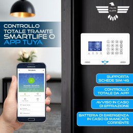Antifurto Casa senza Fili gestibile da APP "Smartlife" e "Tuya", compatibile con Amazon Alexa Dimensioni centralina: lunghezza 20 cm circa larghezza 13.5 cm circa spessore 2.5 cm circa La scheda SIM serve solo per ricevere telefonare ed SMS, non per utilizzare l'APP