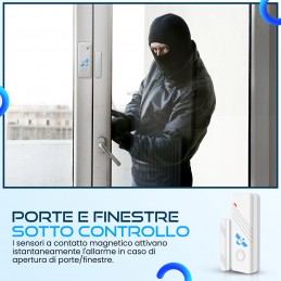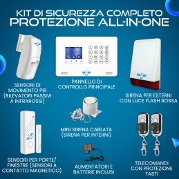 Il KIT comprende: 1 centrale Futura 4g + WiFi 6 sensori finestra 1 sirena filare da interno 4 sensori di movimento PIR 4 sensori tenda