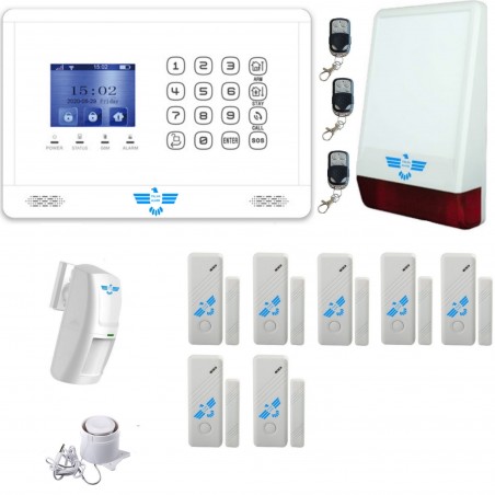 Il KIT contiene: 1 centrale MICRO TOUCH 3 telecomandi 1 sensore movimento 7 sensori magnetici allarme porta finestra 1 minisirena da interno 1 sirena alimentata wireless da esterno Batterie incluse In caso di errori fa fede la foto del prodotto