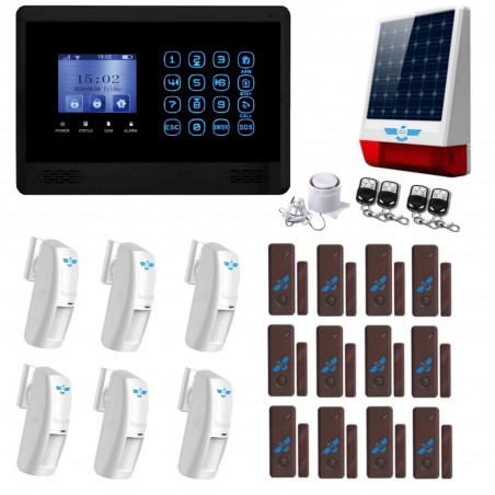 Il KIT "459" include 1 centrale MICRO TOUCH 1 sirena da esterno alimentata 4 telecomandi 1 mini sirena filare da interno 5 sensori PIR di movimento da interno 9 sensori magnetici di colore marrone