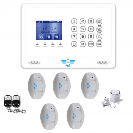 Il KIT "459" include 1 centrale MICRO TOUCH 1 sirena da esterno alimentata 4 telecomandi 1 mini sirena filare da interno 5 sensori PIR di movimento da interno 9 sensori magnetici di colore marrone