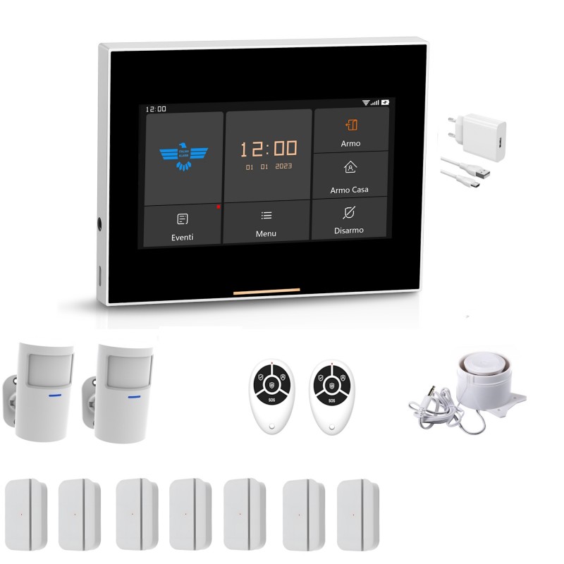 Il KIT comprende: 3 telecomandi con cover anti pressione tasti accidentale 3 PIR 10 sensori magnetici 1 sirena da esterno la sirena da interno è integrata alla centrale