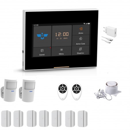 Il KIT comprende: 1 centralina MICRO TOUCH 1 sirena da interno filare 1 sirena da esterno wireless alimentata 3 sensori PIR 5 sensori magnetici 3 telecomandi