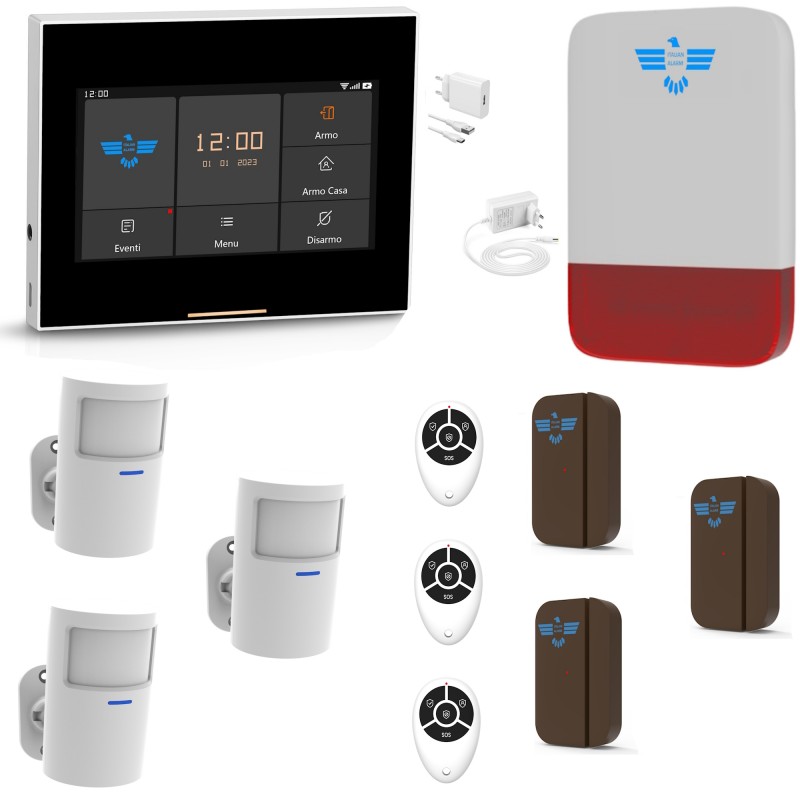 Il KIT comprende: 3 telecomandi con cover anti pressione tasti accidentale 3 PIR 10 sensori magnetici 1 sirena da esterno la sirena da interno è integrata alla centrale