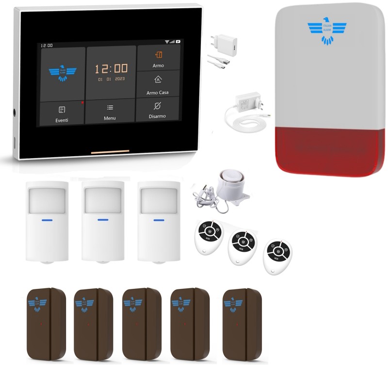 Il KIT comprende: 1 centralina MICRO TOUCH 1 sirena da interno filare 1 sirena da esterno wireless alimentata 3 sensori PIR 5 sensori magnetici 3 telecomandi