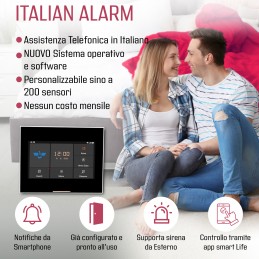 Il KIT è composto da 1 centralina MICRO TOUCH WiFi + modulo 4G 4 telecomandi 1 sirena filare da interno 1 sirena alimentata da esterno 4 sensori di movimento da interno immuni agli animali sino a 10 Kg 1 sensore magnetico apertura porte/finestre (non va installato su ferro)