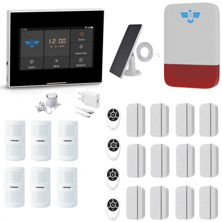 Il KIT comprende: 1 centralina FUTURA GSM + WiFi 1 sirena wireless alimentata 1 sirena filare 3 telecomandi 1 sensore PIR di movimento da interno 7 sensori magnetici apertura porta / finestra